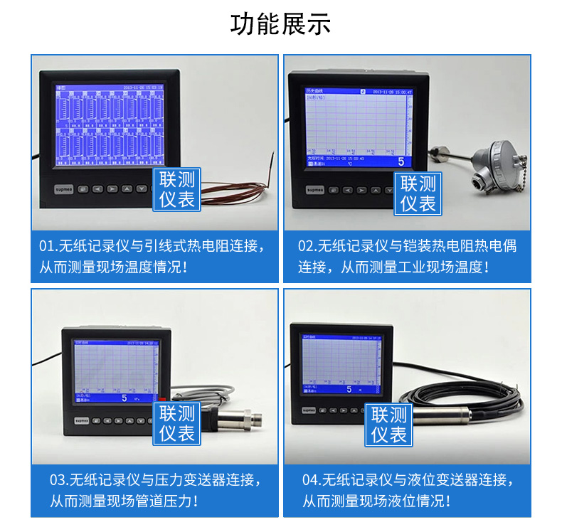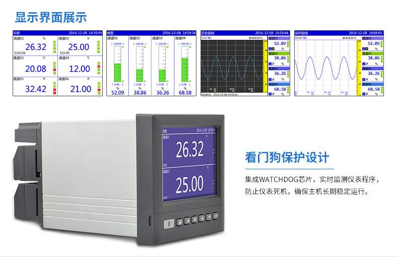 無(wú)紙記錄儀是將采集的數(shù)據(jù)/運(yùn)算數(shù)據(jù)以時(shí)間為基軸記錄在儀器內(nèi)部的存儲(chǔ)系統(tǒng)中,無(wú)消耗任何常用的記錄設(shè)施,如:紙張、筆墨。記錄在儀器內(nèi)部的存儲(chǔ)數(shù)據(jù),通過(guò)運(yùn)算、模擬后顯示在液晶屏。常用顯示用液晶屏比較廣泛。在液晶屏屏幕上,可以顯示數(shù)字顯示、棒圖顯示、曲線顯示、報(bào)警列表等。無(wú)紙記錄儀采集的數(shù)據(jù),常用的有:溫度、壓力、流量、液位、電壓、電流、濕度、頻率、振動(dòng)、轉(zhuǎn)速等。